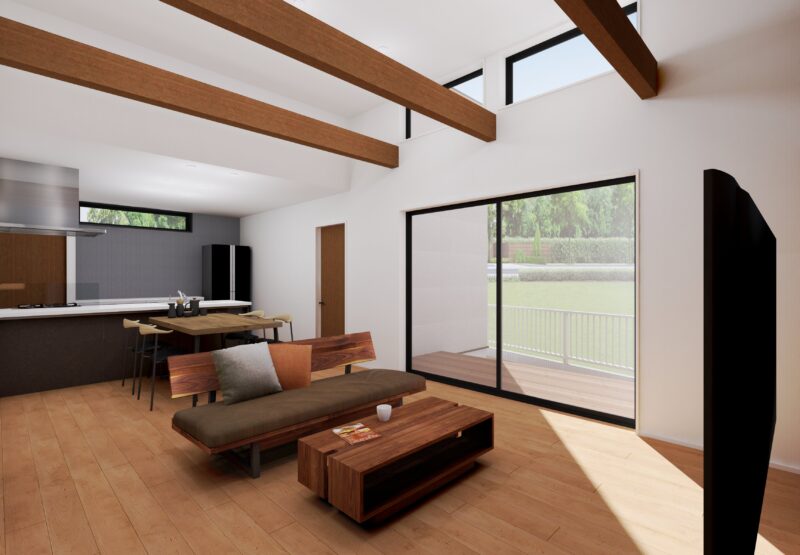 南側には大きな掃き出し窓と高窓を配置し、自然光がやさしく降りそそぐ明るい空間に。